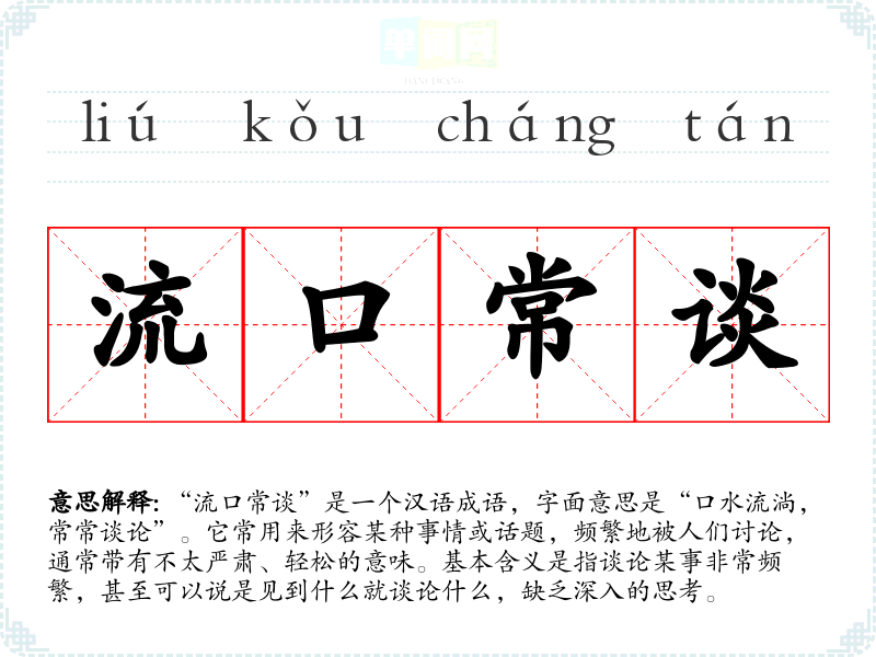 “流口常谈”是一个汉语成语,字面意思是“口水流淌,常常谈论”。它常用来形容某种事情或话题,频繁地被人们讨论,通常带有不太严肃、轻松的意味。基本含义是指谈论某事非常频繁,甚至可以说是见到什么就谈论什么,缺乏深入的思考。