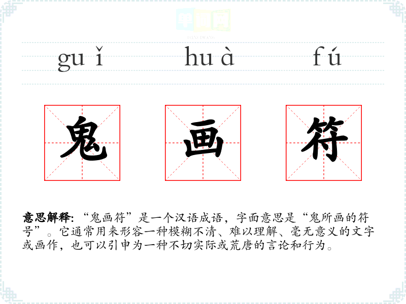 “鬼画符”是一个汉语成语,字面意思是“鬼所画的符号”。它通常用来形容一种模糊不清、难以理解、毫无意义的文字或画作,也可以引申为一种不切实际或荒唐的言论和行为。