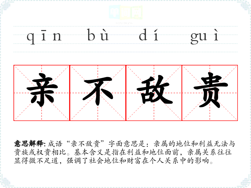 成语“亲不敌贵”字面意思是:亲属的地位和利益无法与贵族或权贵相比。基本含义是指在利益和地位面前,亲属关系往往显得微不足道,强调了社会地位和财富在个人关系中的影响。