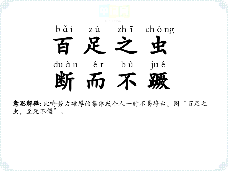 | 百足之虫,断而不蹶 | 比喻势力雄厚的集体或个人一时不易垮台。同“百足之虫,至死不僵”。 |