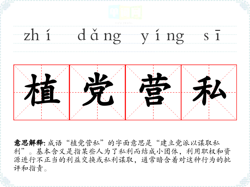 成语“植党营私”的字面意思是“建立党派以谋取私利”。基本含义是指某些人为了私利而结成小团体,利用职权和资源进行不正当的利益交换或私利谋取,通常暗含着对这种行为的批评和指责。