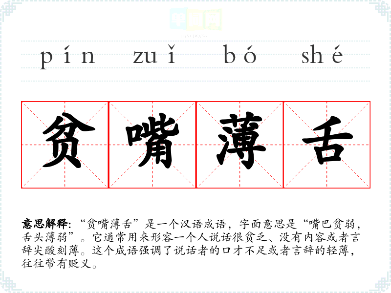 “贫嘴舌”是一个汉语成语,字面意思是“嘴巴贫弱,舌头弱”。它通常用来形容一个人说话很贫乏、没有内容或者言辞尖酸刻。这个成语强调了说话者的口才不足或者言辞的轻,往往带有贬义。
