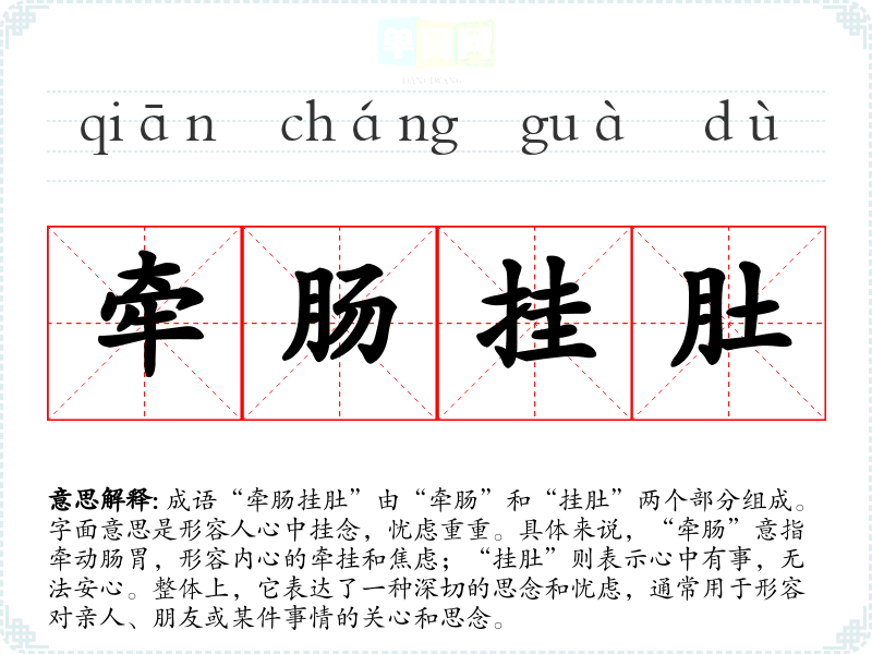 成语“牵肠挂肚”由“牵肠”和“挂肚”两个部分组成。字面意思是形容人心中挂念,忧虑重重。具体来说,“牵肠”意指牵动肠胃,形容内心的牵挂和焦虑;“挂肚”则表示心中有事,无法安心。整体上,它表达了一种深切的思念和忧虑,通常用于形容对亲人、朋友或某件事情的关心和思念。