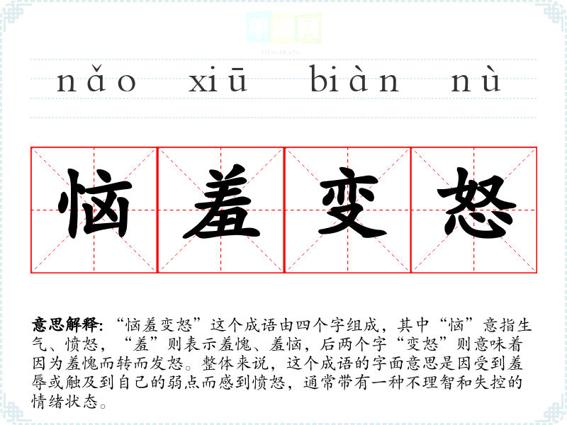 “恼羞变怒”这个成语由四个字组成,其中“恼”意指生气、愤怒,“羞”则表示羞愧、羞恼,后两个字“变怒”则意味着因为羞愧而转而发怒。整体来说,这个成语的字面意思是因受到羞辱或触及到自己的弱点而感到愤怒,通常带有一种不理智和失控的情绪状态。