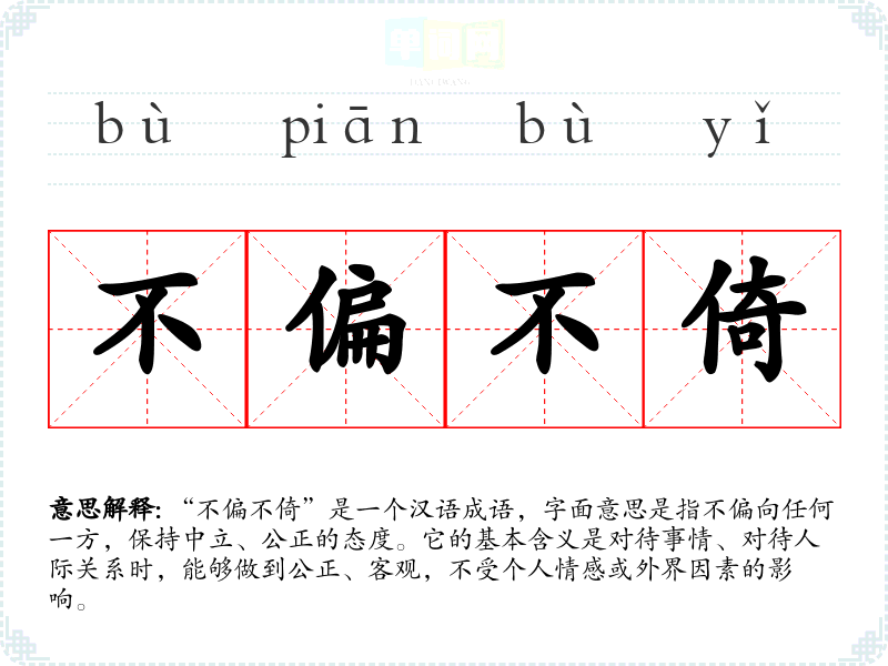 “不偏不倚”是一个汉语成语,字面意思是指不偏向任何一方,保持中立、公正的态度。它的基本含义是对待事情、对待人际关系时,能够做到公正、客观,不受个人情感或外界因素的影响。