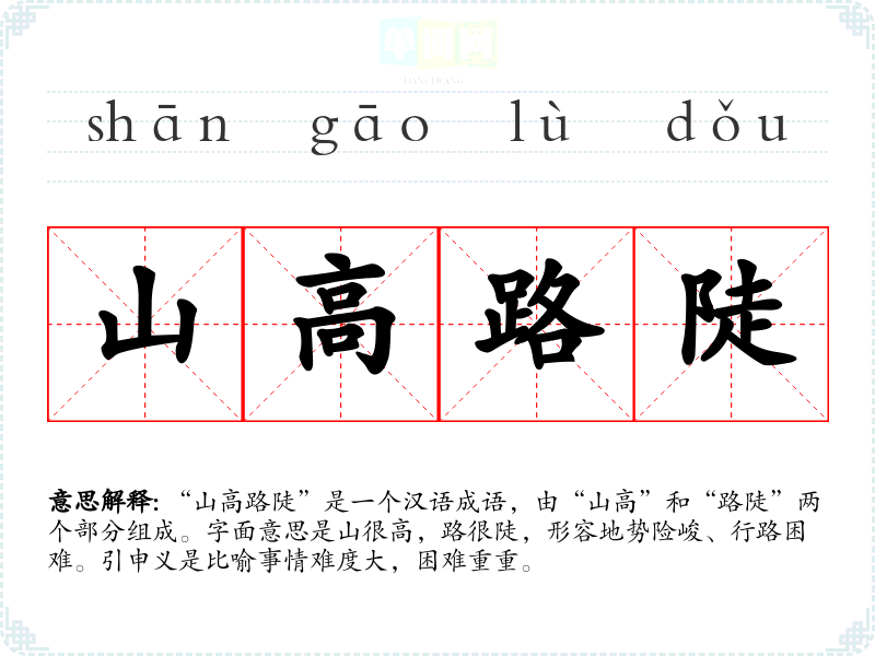 “山高路陡”是一个汉语成语,由“山高”和“路陡”两个部分组成。字面意思是山很高,路很陡,形容地势险峻、行路困难。引申义是比喻事情难度大,困难重重。