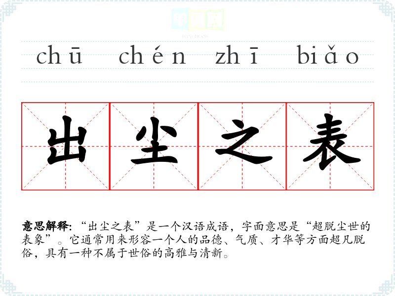“出尘之表”是一个汉语成语,字面意思是“超脱尘世的表象”。它通常用来形容一个人的品德、气质、才华等方面超凡脱俗,具有一种不属于世俗的高雅与清新。