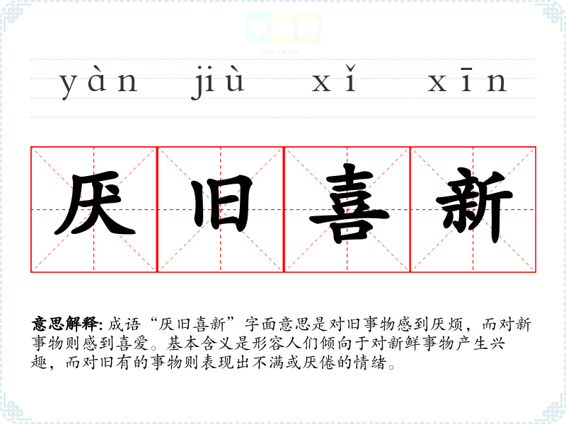成语“厌旧喜新”字面意思是对旧事物感到厌烦,而对新事物则感到喜爱。基本含义是形容人们倾向于对新鲜事物产生兴趣,而对旧有的事物则表现出不满或厌倦的情绪。