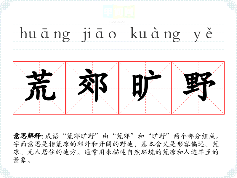 | 荒郊旷野 | 指人迹罕至,空旷荒凉的郊外。 |