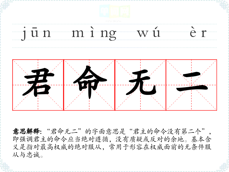 “君命无二”的字面意思是“君主的命令没有第二个”,即强调君主的命令应当绝对遵循,没有质疑或反对的余地。基本含义是指对最高权威的绝对服从,常用于形容在权威面前的无条件服从与忠诚。