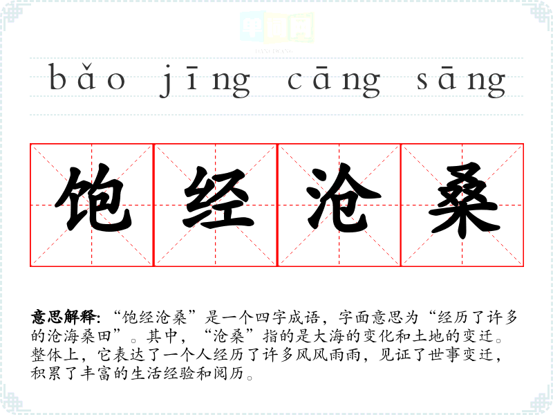“饱经沧桑”是一个四字成语,字面意思为“经历了许多的沧海桑田”。其中,“沧桑”指的是大海的变化和土地的变迁。整体上,它表达了一个人经历了许多风风雨雨,见证了世事变迁,积累了丰富的生活经验和阅历。