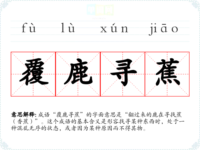 成语“覆鹿寻蕉”的字面意思是“翻过来的鹿在寻找蕉(香蕉)”。这个成语的基本含义是形容找寻某种东西时,处于一种混乱无序的状态,或者因为某种原因而不得其物。
