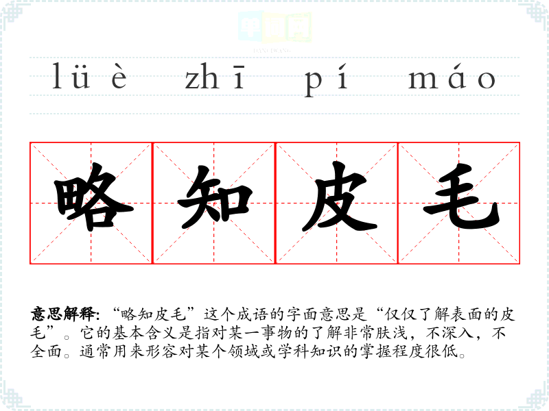 “略知皮毛”这个成语的字面意思是“仅仅了解表面的皮毛”。它的基本含义是指对某一事物的了解非常肤浅,不深入,不全面。通常用来形容对某个领域或学科知识的掌握程度很低。