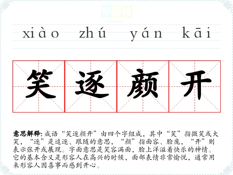 成语“笑逐颜开”由四个字组成,其中“笑”指微笑或大笑,“逐”是追逐、跟随的意思,“颜”指面容、脸庞,“开”则表示张开或展现。字面意思是笑容满面,脸上洋溢着快乐的神情。它的基本含义是形容人在高兴的时候,面部表情非常愉悦,通常用来形容人因喜事而感到开心。