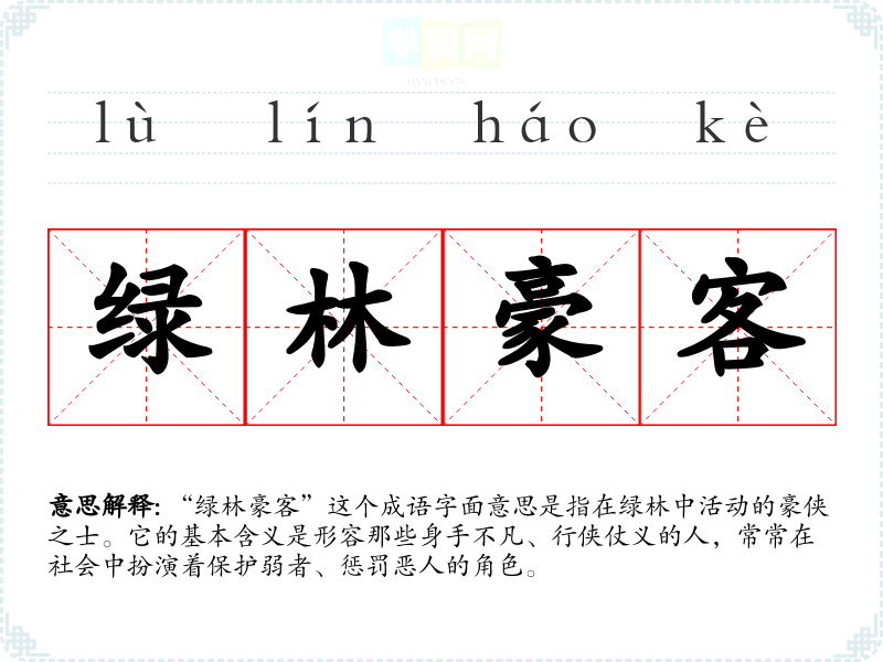 - 反义成语:为非作歹、狼狈为奸。与“绿林豪客”所代表的正义形象相反,表达了不道德或邪恶的行为。