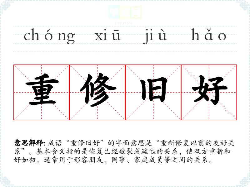 - 演讲:在讨论人际关系或社会和谐时,可以引用“重修旧好”来强调和解的重要性。