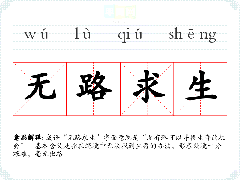成语“无路求生”字面意思是“没有路可以寻找生存的机会”。基本含义是指在绝境中无法找到生存的办法,形容处境十分艰难,毫无出路。