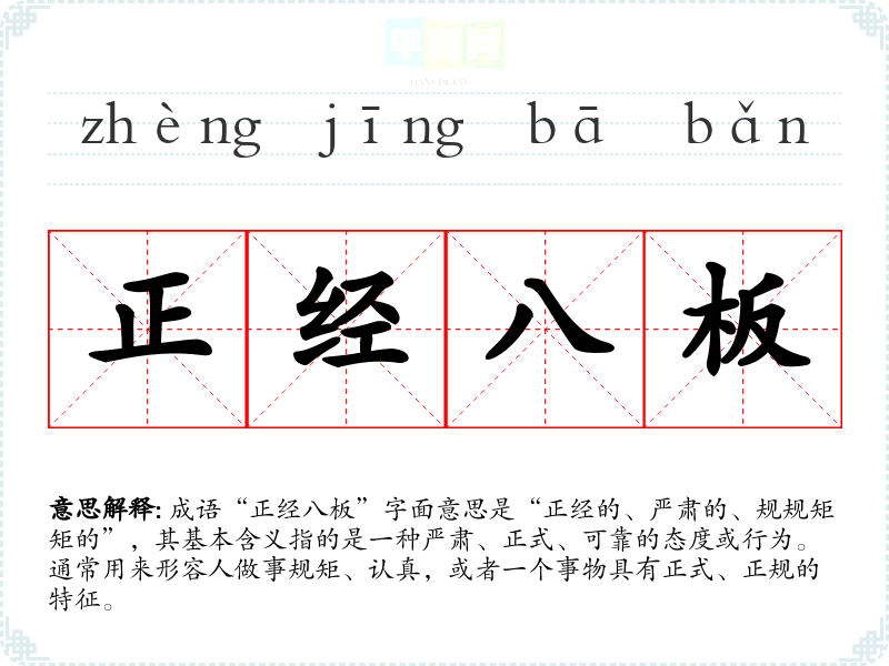成语“正经八板”字面意思是“正经的、严肃的、规规矩矩的”,其基本含义指的是一种严肃、正式、可靠的态度或行为。通常用来形容人做事规矩、认真,或者一个事物具有正式、正规的特征。