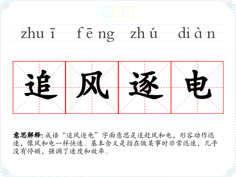 在现代社会,特别是在快节奏的生活和工作环境中,“追风逐电”反映了人们对效率和快速反应的重视。它不仅适用于商业领域,也适用于科技发展和个人成长,强调了在竞争中生存的必要性。