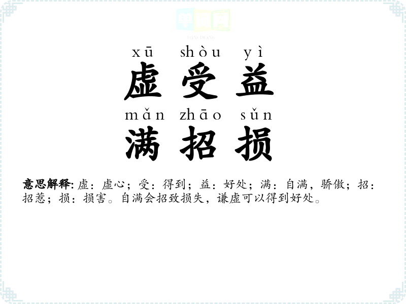 | 虚受益,满招损 | 虚:虚心;受:得到;益:好处;满:自满,骄傲;招:招惹;损:损害。自满会招致损失,谦虚可以得到好处。 |