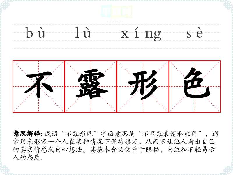 成语“不露形色”字面意思是“不显露表情和颜色”,通常用来形容一个人在某种情况下保持镇定,从而不让他人看出自己的真实情感或内心想法。其基本含义侧重于隐秘、内敛和不轻易示人的态度。