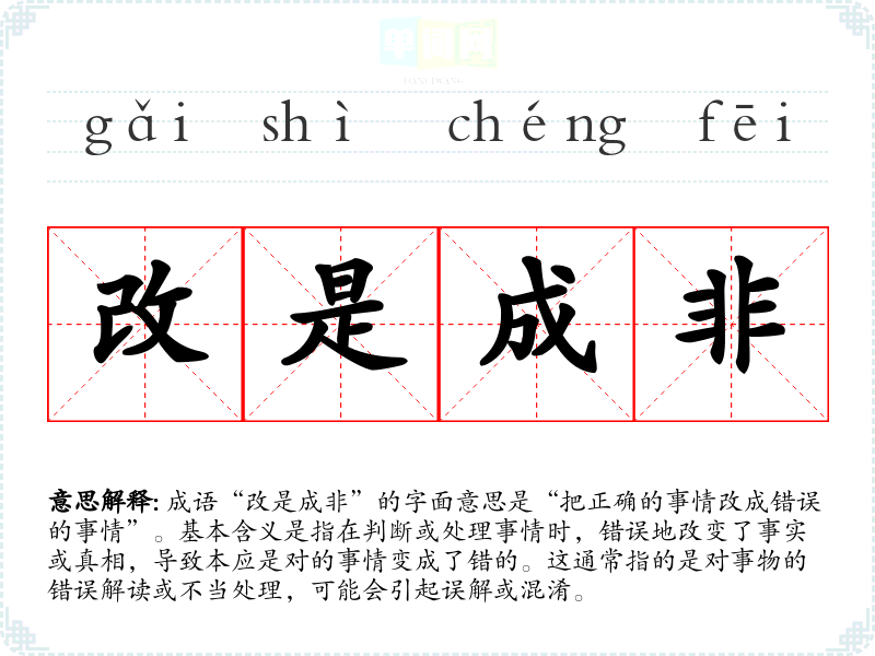 成语“改是成非”的字面意思是“把正确的事情改成错误的事情”。基本含义是指在判断或处理事情时,错误地改变了事实或真相,导致本应是对的事情变成了错的。这通常指的是对事物的错误解读或不当处理,可能会引起误解或混淆。