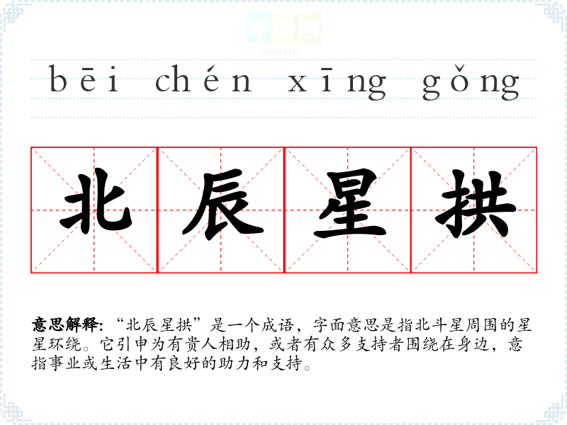 “北辰星拱”是一个成语,字面意思是指北斗星周围的星星环绕。它引申为有贵人相助,或者有众多支持者围绕在身边,意指事业或生活中有良好的助力和支持。