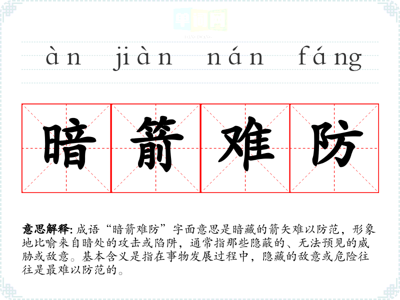 成语“暗箭难防”字面意思是暗藏的箭矢难以防范,形象地比喻来自暗处的攻击或陷阱,通常指那些隐蔽的、无法预见的威胁或敌意。基本含义是指在事物发展过程中,隐藏的敌意或危险往往是最难以防范的。
