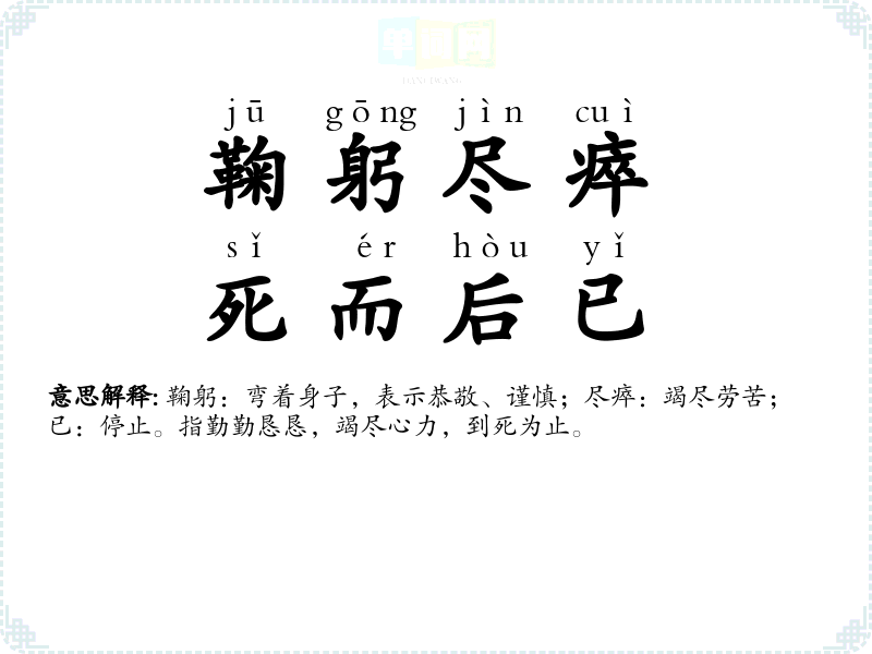 | 鞠躬尽力,死而后已 | 恭敬勤谨,尽心竭力工作,一直到死为止。 |