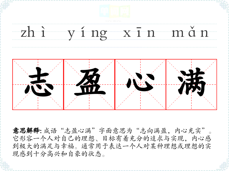 该成语让我联想到奋斗与成就,传递出一种积极向上的情绪。在学*或工作中,面对困难时,内心的“志盈心满”能激励我继续努力,保持对未来的期待与信心。