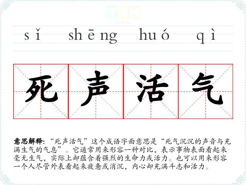 “死声活气”这个成语字面意思是“死气沉沉的声音与充满生气的气息”。它通常用来形容一种对比,表示事物表面看起来毫无生气,实际上却蕴含着强烈的生命力或活力。也可以用来形容一个人尽管外表看起来疲惫或消沉,内心却充满斗志和活力。