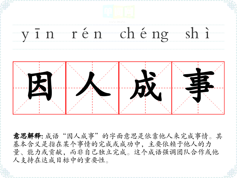 “因人成事”并没有明确的历史典故或文学出处,但其表达的思想在**传统文化中广泛存在。古代文人强调“众人拾柴火焰高”,同样表达了依赖他人、团队合作的重要性。成语的构成也体现了汉字文化的特点,通过简单的字词组合传达出深刻的道理。