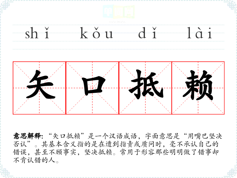 “矢口抵赖”是一个汉语成语,字面意思是“用嘴巴坚决否认”。其基本含义指的是在遭到指责或质问时,毫不承认自己的错误,甚至不顾事实,坚决抵赖。常用于形容那些明明做了错事却不肯认错的人。