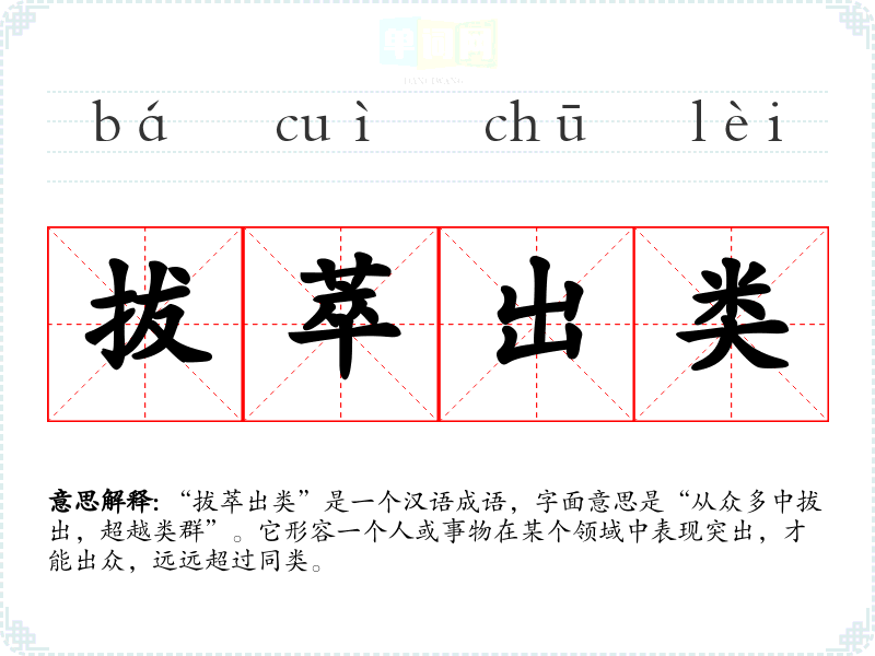 “拔萃出类”是一个汉语成语,字面意思是“从众多中拔出,超越类群”。它形容一个人或事物在某个领域中表现突出,才能出众,远远超过同类。