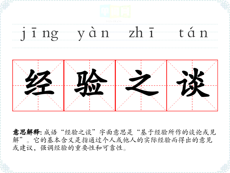 成语“经验之谈”字面意思是“基于经验所作的谈论或见解”。它的基本含义是指通过个人或他人的实际经验而得出的意见或建议,强调经验的重要性和可靠性。