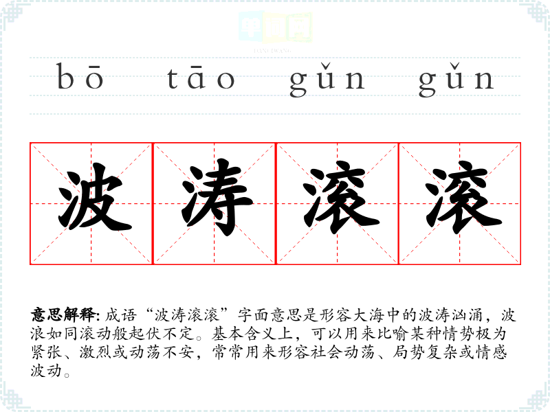 “波涛滚滚”并没有明确的古代典故,但“波涛”一词在古典诗词中常用来描绘大海的壮丽与雄浑,表现自然的力量与气氛。其组合形式在现代汉语中逐渐形成,成为一种形象生动的表达方式。