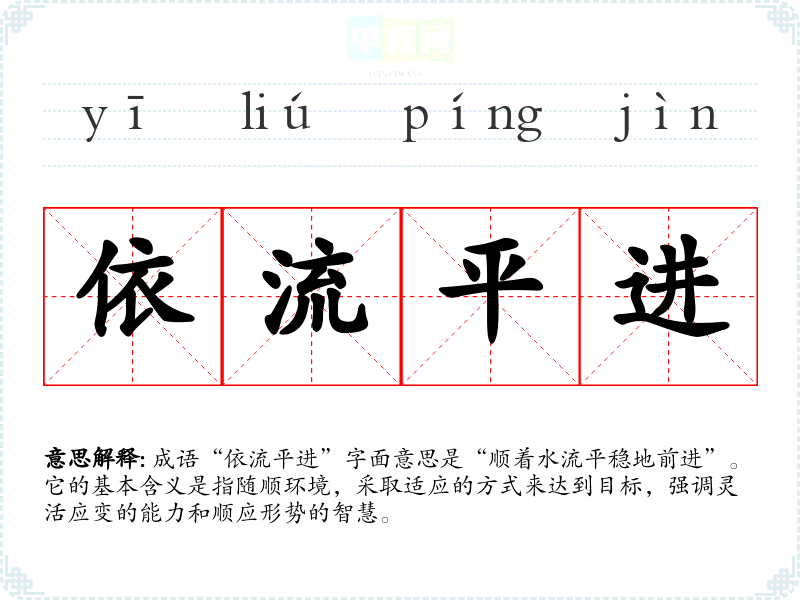 通过对“依流平进”的学,我更加理解了在生活和学中灵活应对的重要性。这个成语不仅丰富了我的语言表达,也让我在实际情境中更加自信地调整自己的策略。它提醒我,面对变化,保持开放的心态,灵活应变,才能更好地应对挑战。