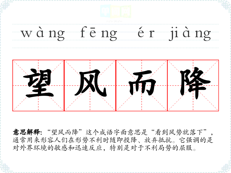 “望风而降”这个成语字面意思是“看到风势就落下”,通常用来形容人们在形势不利时随即投降、放弃抵抗。它强调的是对外界环境的敏感和迅速反应,特别是对于不利局势的屈服。