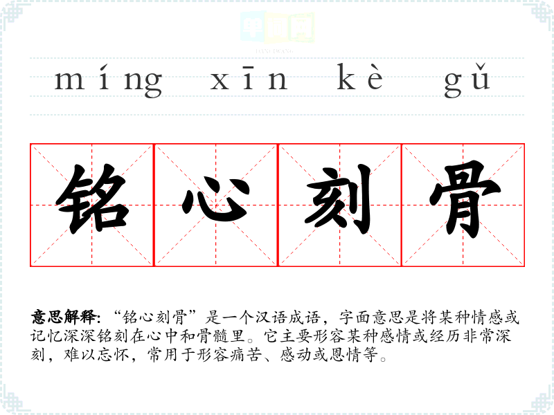 | 铭心刻骨 | 刻写在心上骨上,形容记忆深刻,难以忘记。 |