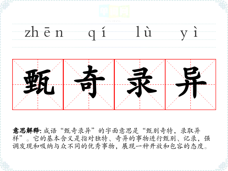 成语“甄奇录异”的字面意思是“甄别奇特,录取异样”。它的基本含义是指对独特、奇异的事物进行甄别、记录,强调发现和吸纳与众不同的优秀事物,展现一种开放和包容的态度。