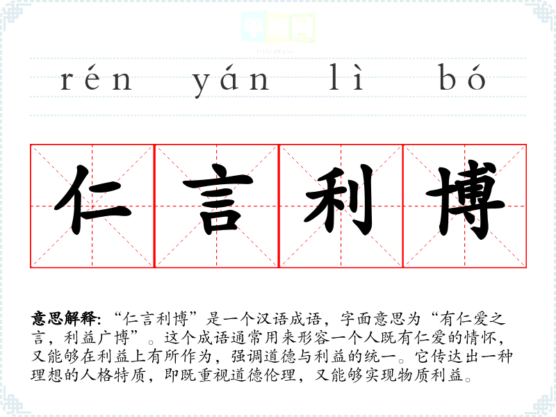 “仁言利博”是一个汉语成语,字面意思为“有仁爱之言,利益广博”。这个成语通常用来形容一个人既有仁爱的情怀,又能够在利益上有所作为,强调道德与利益的统一。它传达出一种理想的人格特质,即既重视道德伦理,又能够实现物质利益。