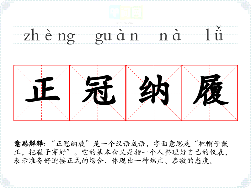 “正冠纳履”是一个汉语成语,字面意思是“把帽子戴正,把鞋子穿好”。它的基本含义是指一个人整理好自己的仪表,表示准备好迎接正式的场合,体现出一种端庄、恭敬的态度。