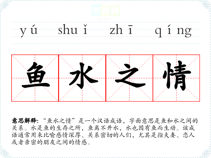 “鱼水之情”是一个汉语成语,字面意思是鱼和水之间的关系。水是鱼的生存之所,鱼离不开水,水也因有鱼而生动。该成语通常用来比喻感情深厚、关系密切的人们,尤其是指夫妻、恋人或者亲密的朋友之间的情感。