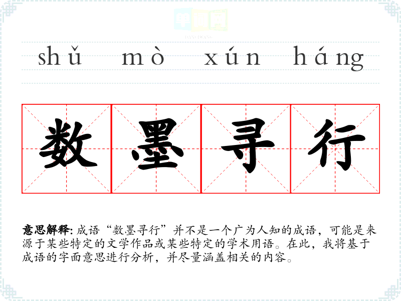 成语“数墨寻行”并不是一个广为人知的成语,可能是来源于某些特定的文学作品或某些特定的学术用语。在此,我将基于成语的字面意思进行分析,并尽量涵盖相关的内容。