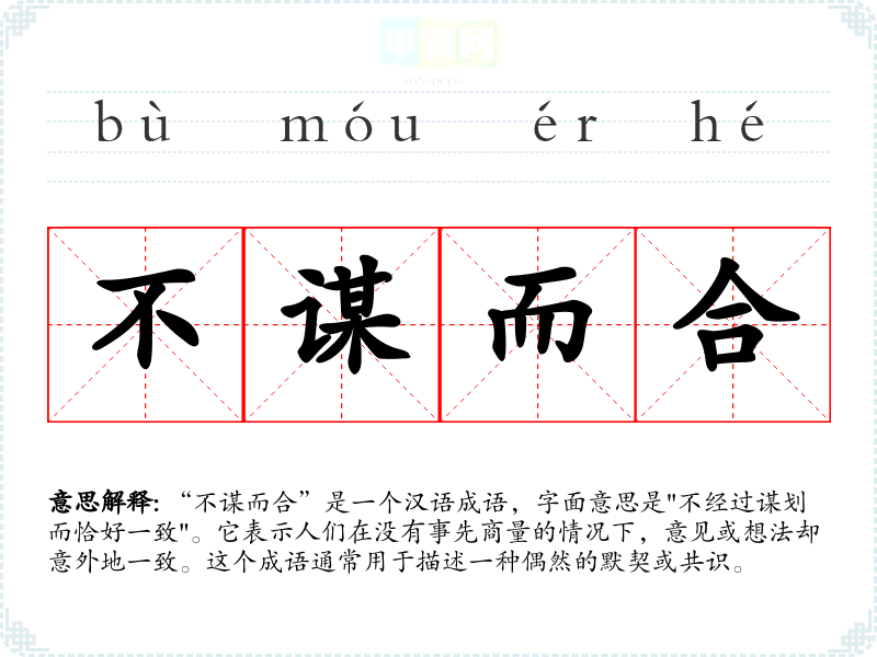 “不谋而合”是一个汉语成语,字面意思是"不经过谋划而恰好一致"。它表示人们在没有事先商量的情况下,意见或想法却意外地一致。这个成语通常用于描述一种偶然的默契或共识。