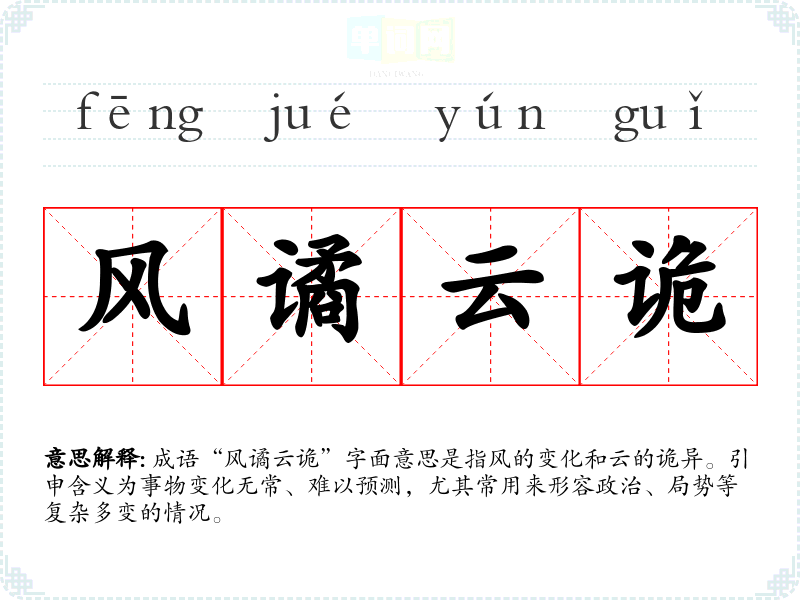 成语“风谲云诡”字面意思是指风的变化和云的诡异。引申含义为事物变化无常、难以预测,尤其常用来形容政治、局势等复杂多变的情况。