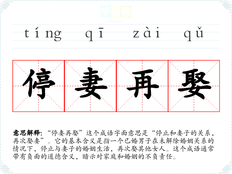 “停妻再娶”这个成语字面意思是“停止和妻子的关系,再次娶妻”。它的基本含义是指一个已婚男子在未解除婚姻关系的情况下,停止与妻子的婚姻生活,再次娶其他女人。这个成语通常带有负面的道德含义,暗示对家庭和婚姻的不负责任。