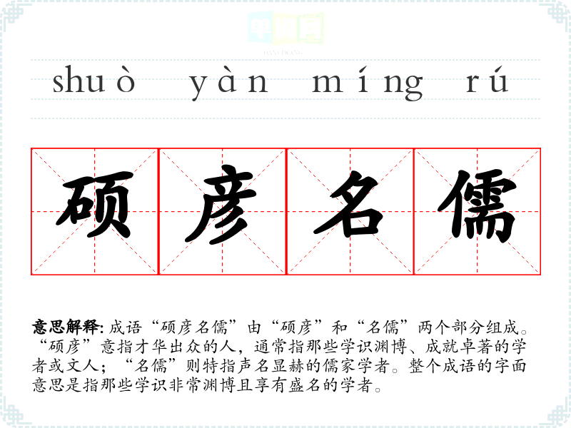 成语“硕彦名儒”由“硕彦”和“名儒”两个部分组成。“硕彦”意指才华出众的人,通常指那些学识渊博、成就卓著的学者或文人;“名儒”则特指声名显赫的儒家学者。整个成语的字面意思是指那些学识非常渊博且享有盛名的学者。