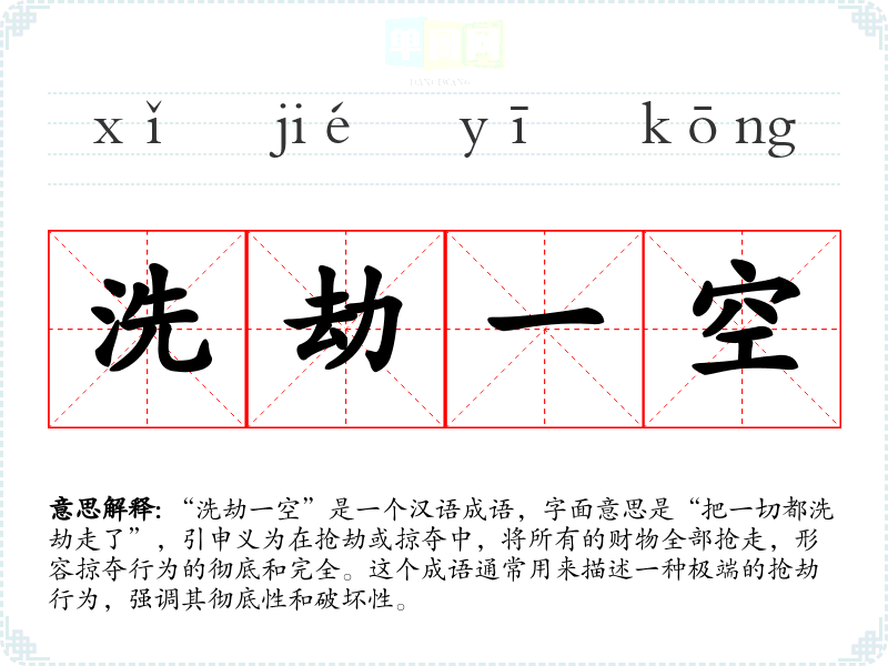 “洗劫一空”是一个汉语成语,字面意思是“把一切都洗劫走了”,引申义为在抢劫或掠夺中,将所有的财物全部抢走,形容掠夺行为的彻底和完全。这个成语通常用来描述一种极端的抢劫行为,强调其彻底性和破坏性。