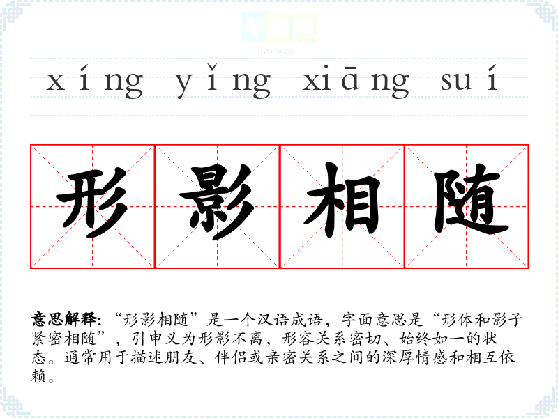 “形影相随”是一个汉语成语,字面意思是“形体和影子紧密相随”,引申义为形影不离,形容关系密切、始终如一的状态。通常用于描述朋友、伴侣或亲密关系之间的深厚情感和相互依赖。